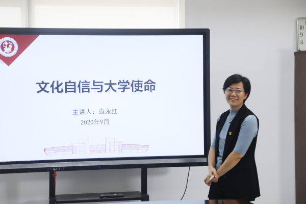 9月23日,党委宣传部党支部书记袁永红在行政楼1404室给支部成员上党课。