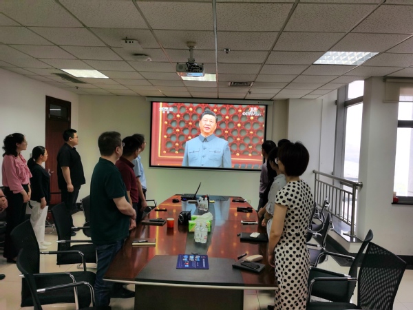 8时整,全体党员职工着装整齐地端坐在会议室,共同见证这一激动人心的历史性时刻。鲜艳的旗帜、庄严的场景、嘹亮的合唱、热烈的氛围,感染着每一个人。大家聚精会神、目不转睛地观看直播盛况,聆听总书记的重要讲话,感怀中国共产党100年来的光辉历程。